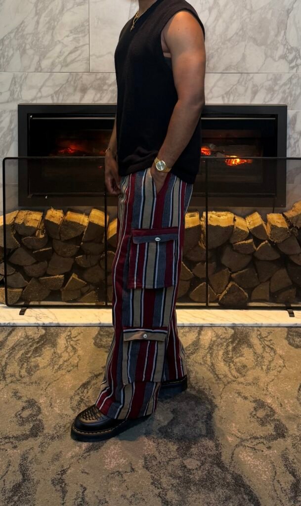 Burgundy and beige hand-woven cargo pants with double side by side patch pockets. This cargo pants combines tradition with modern functionality, crafted from handwoven quality Aso-oke fabric for a rich textured look. Cowrie shells carrying symbolic meaning to evoke cultural pride, abundance and trade legacy. The palazzo cut and structured pockets infuses a touch of timeless elegance, while the elasticated waistband ensures a comfortable and flexible fit. Designed for the modern fashion forward individual who honours tradition while embracing the future.