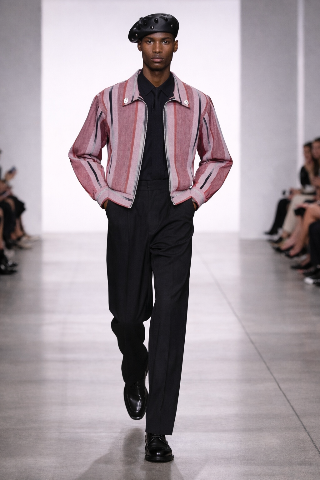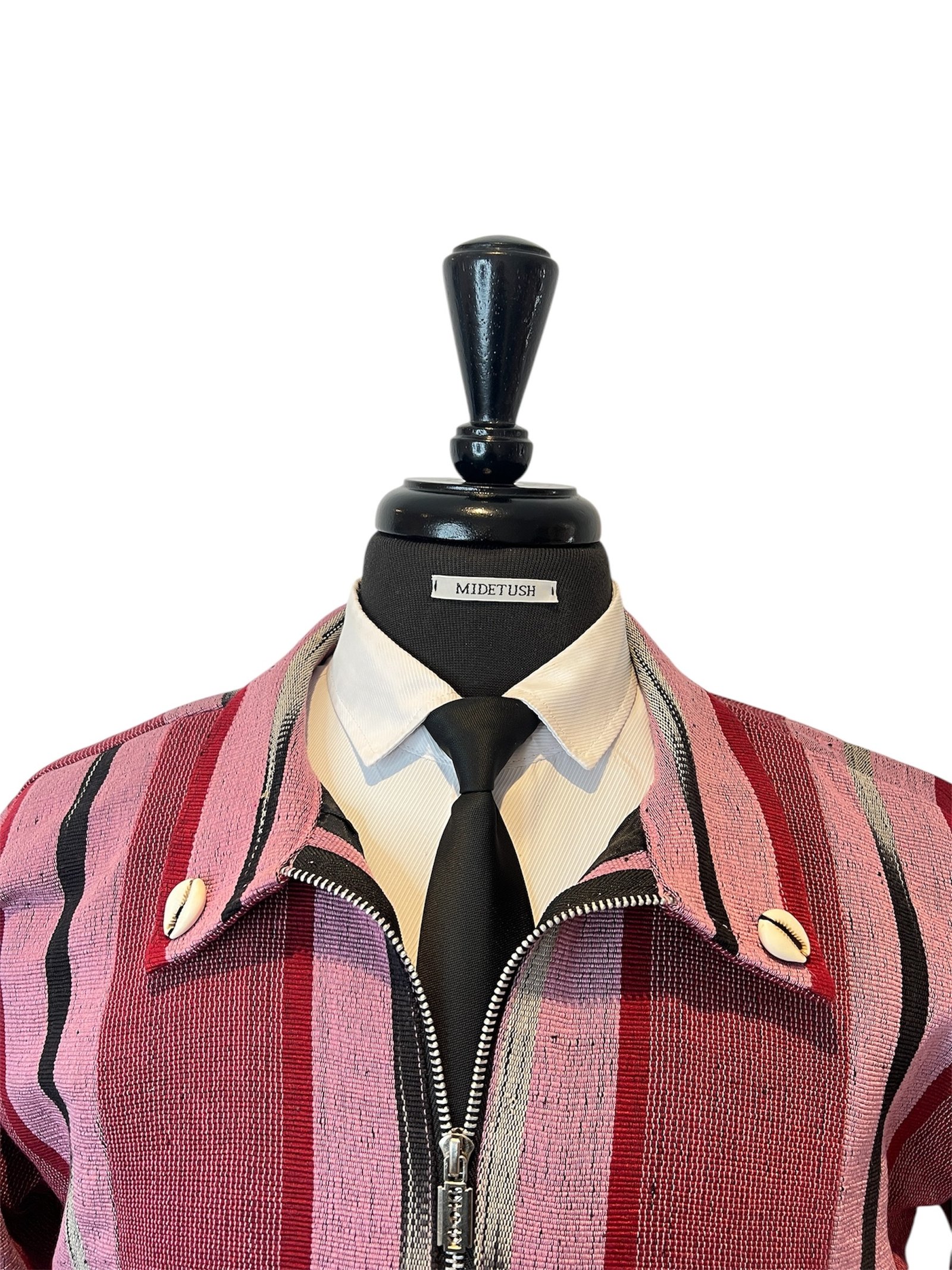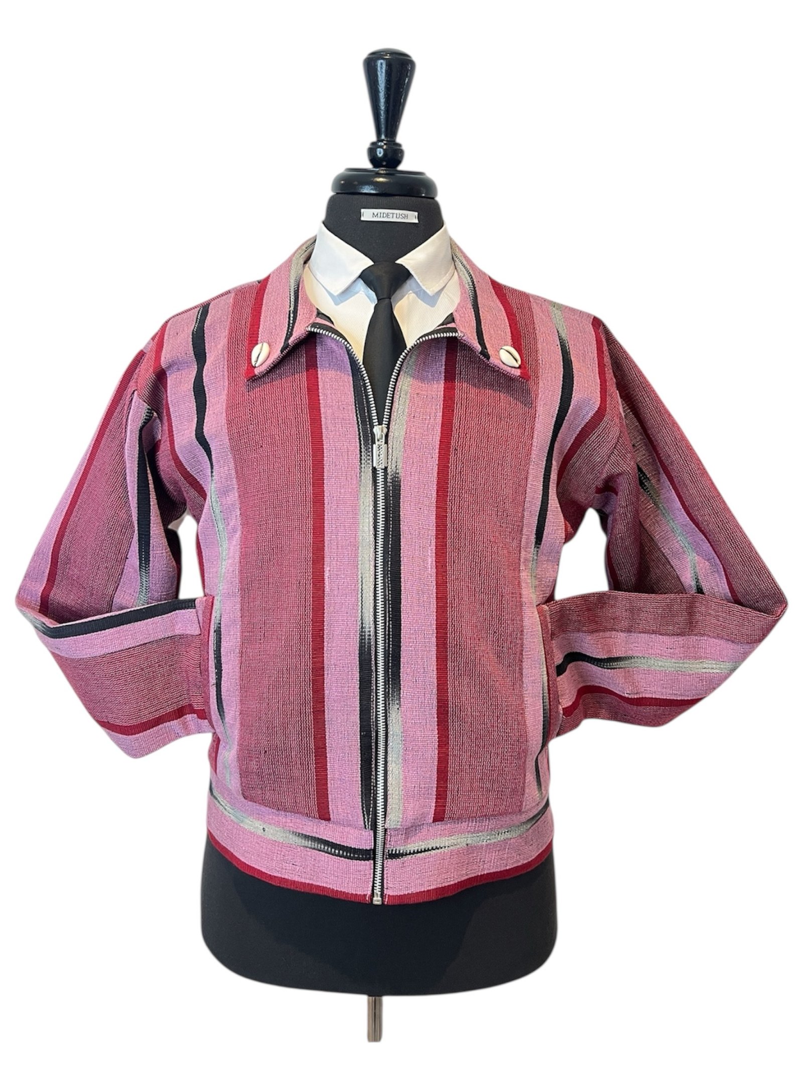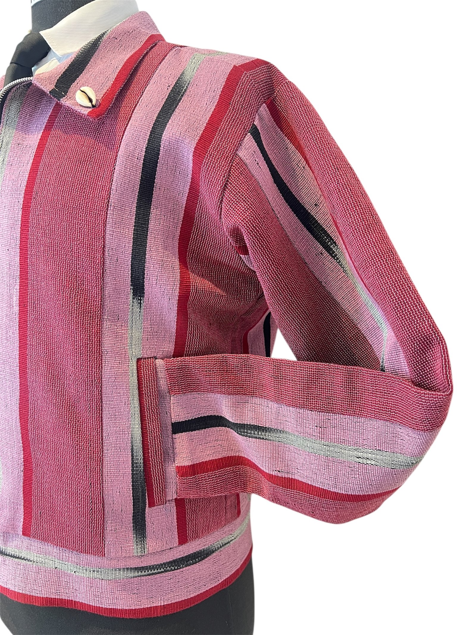 Fuchsia pink and black hand-woven unisex jacket with double side pockets and zipper. This jacket is a re-imagination of the rich tradition of handwoven quality Aso-oke fabric in contemporary silhouette. It represents protection of identity; a modern-day armor worn with pride. It transcends mere fashion with the infusion of structured pockets and cowrie shells symbolizing abundance and trade legacy. Designed for the modern fashion forward individual who honors tradition while embracing the future.
