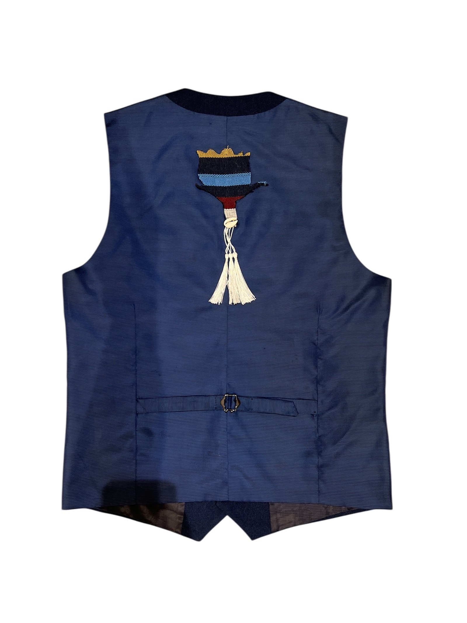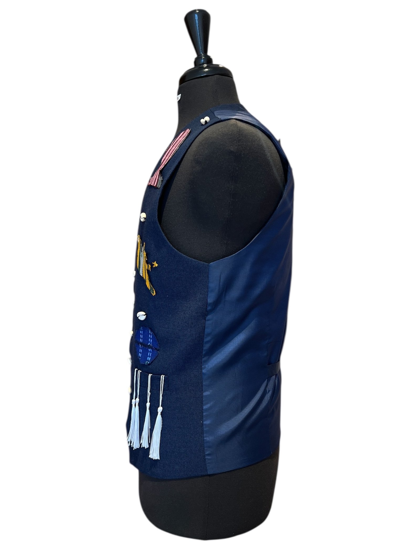 Crafetd from a navy wool fabric, the waistcoat is adorned with hand-cut Aso-Oke motifs arranged in bold geometric shapes, celebrating the artistry of traditional Yoruba weaving.