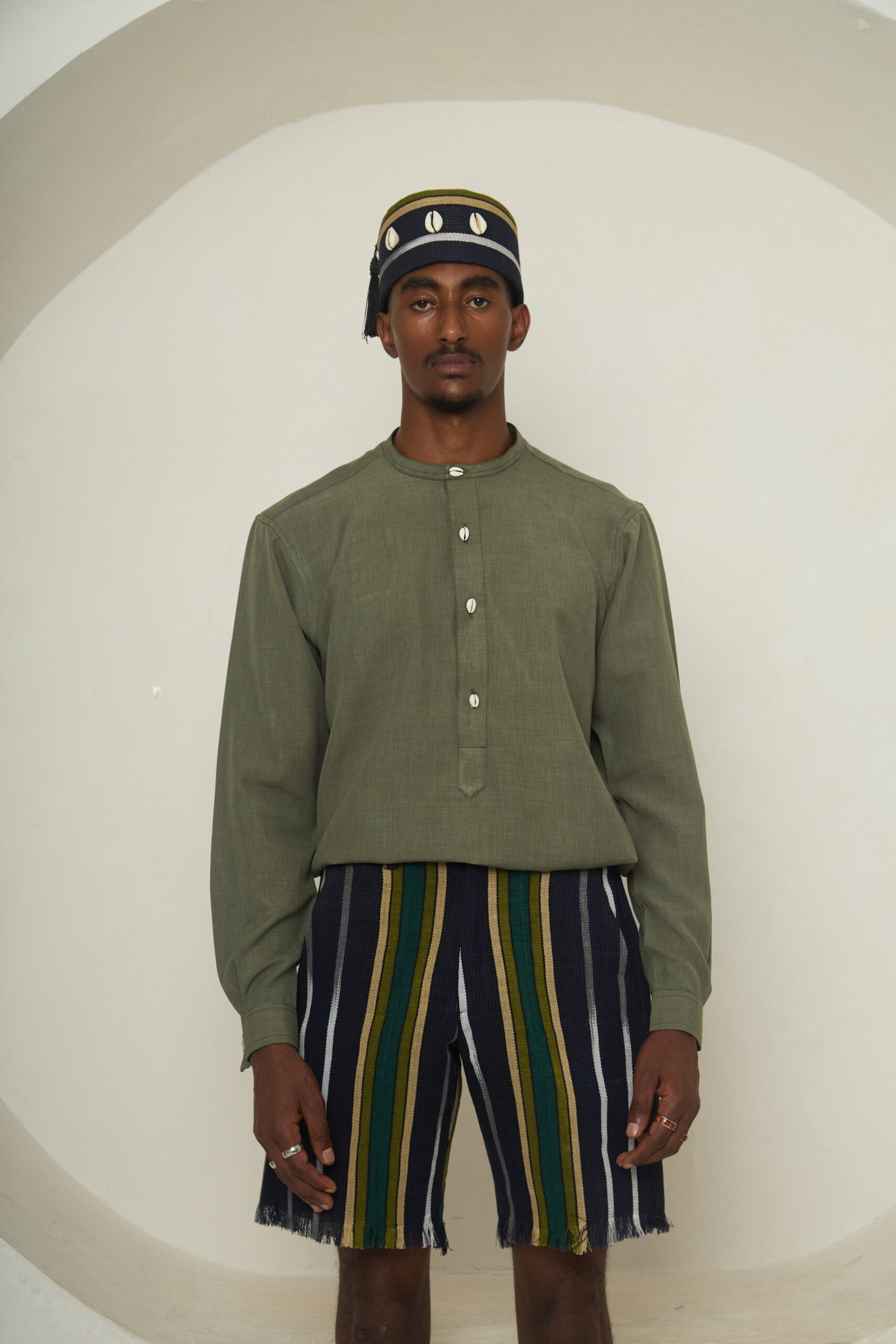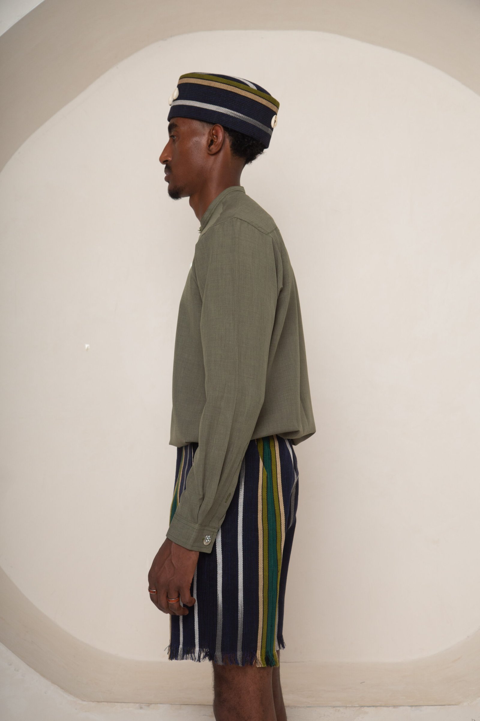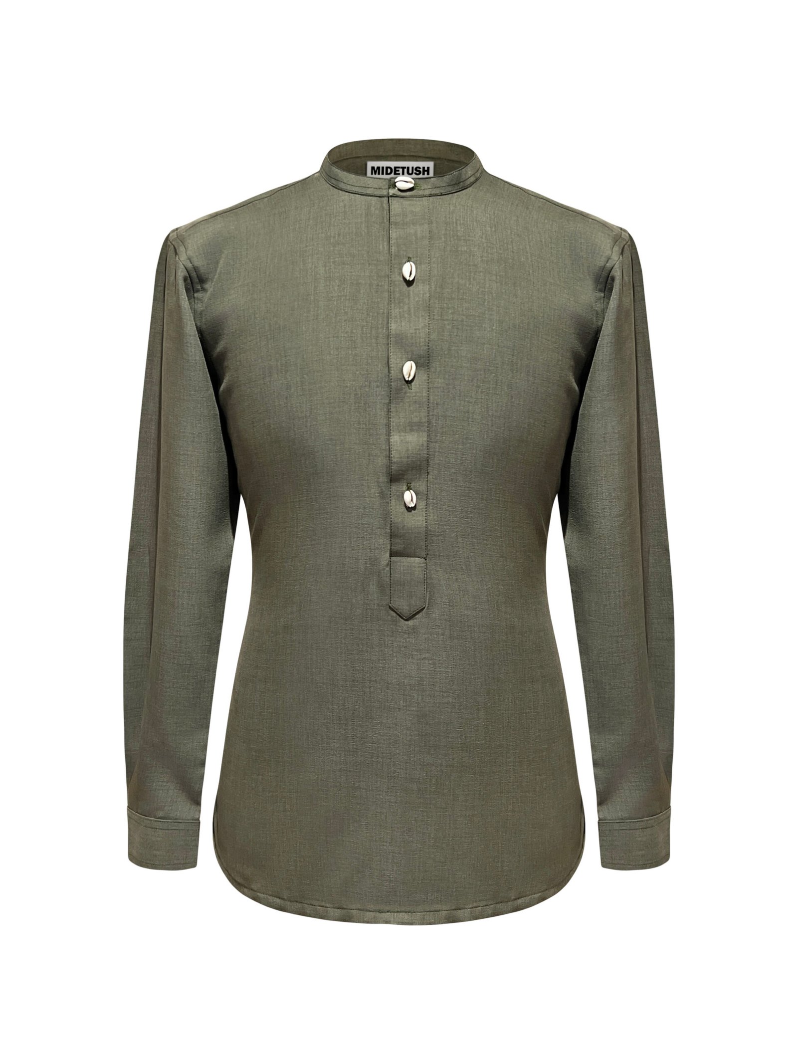Details: Olive green grandad collar with cowrie buttons. Shorter placket. Cufflink-ready