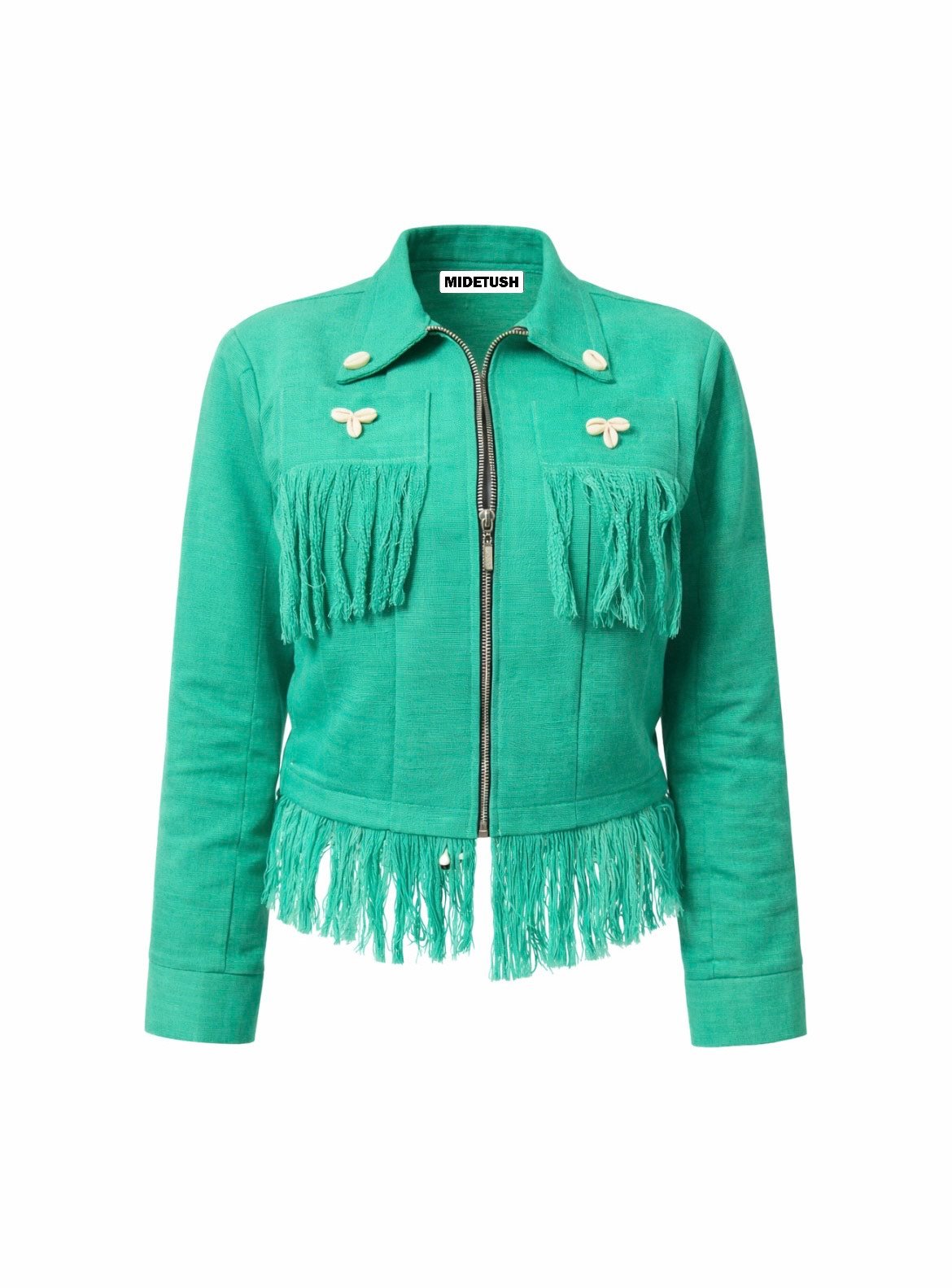shell at the collar tip, fringe at base and concealed pocket